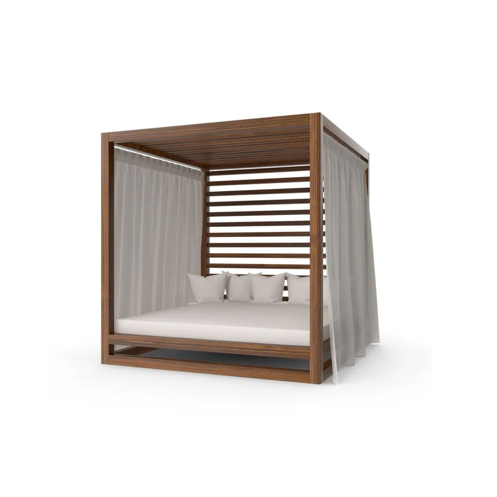 Outdoor Wooden Daybed with Slatted Canopy and Curtains