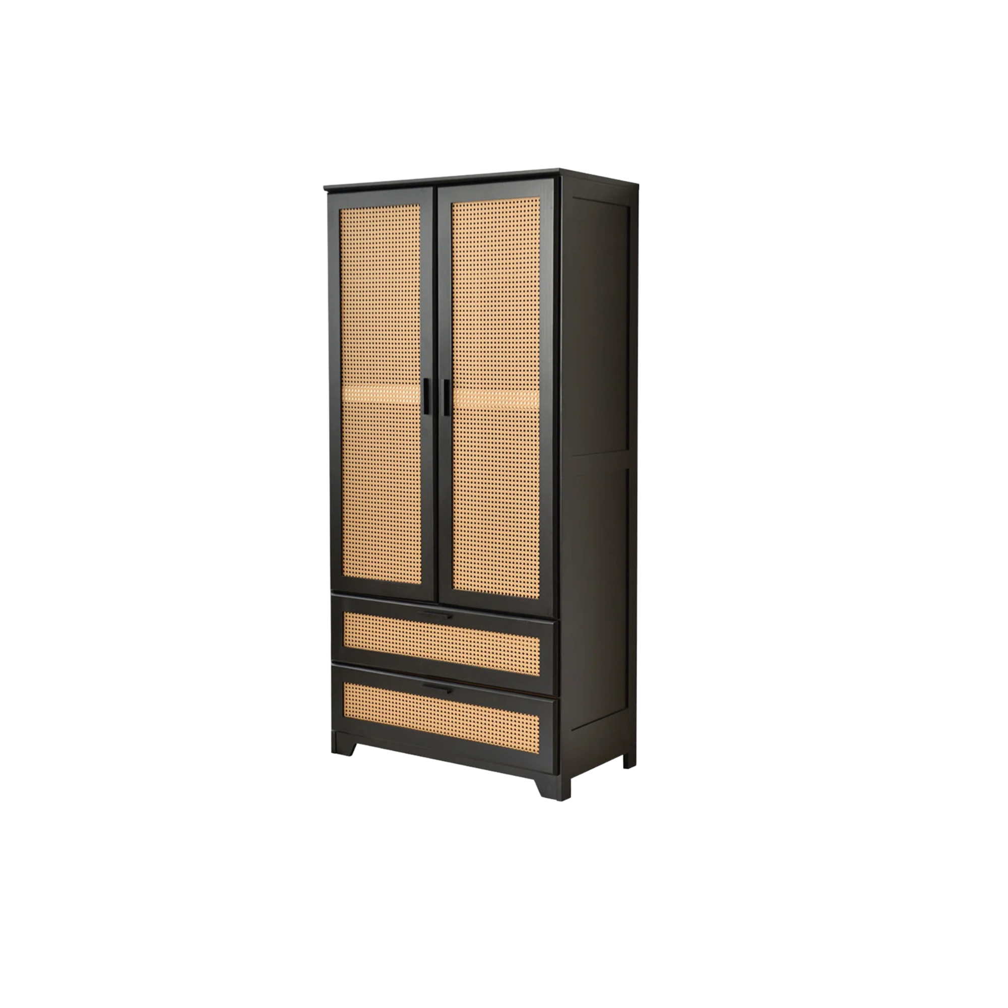 Teak & Rattan Wardrobe with Hanging Space and Storage Drawers
